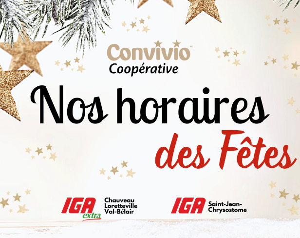 Lire l'articleVoici les horaires des Fêtes vos 4 IGA et IGA extra Convivio : Ces horaires sont valables...