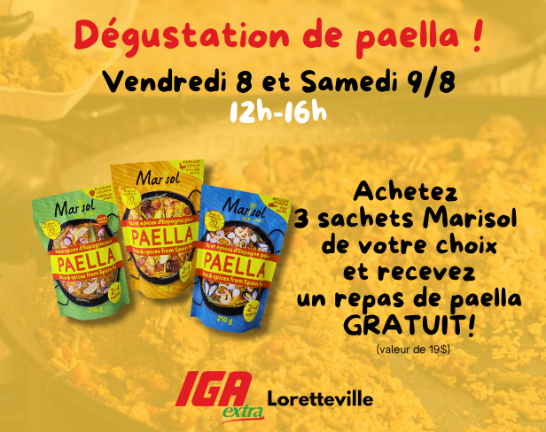 Lire l'articlePaella Marisol débarque vendredi 8 et samedi 9/8 pour faire vibrer vos papilles ! ???? IGA extra Convivio de Loretteville Vendredi 8 et samedi 9/8 de midi à 16h Dégustation...