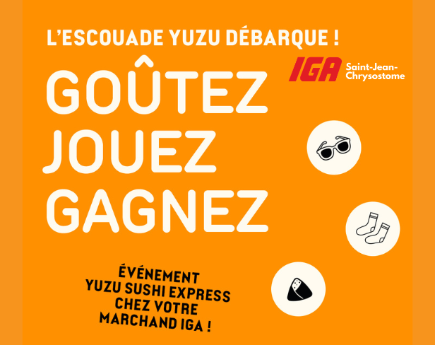 Lire l'articleDimanche, le 19 avril,de 11h à 17h, l'escouade Yuzu sera de passage dans votre IGA de Saint-Jean-Chrysostome pour vous faire goûter à des spécialités et vous faire vivre une expérience gourmande...
