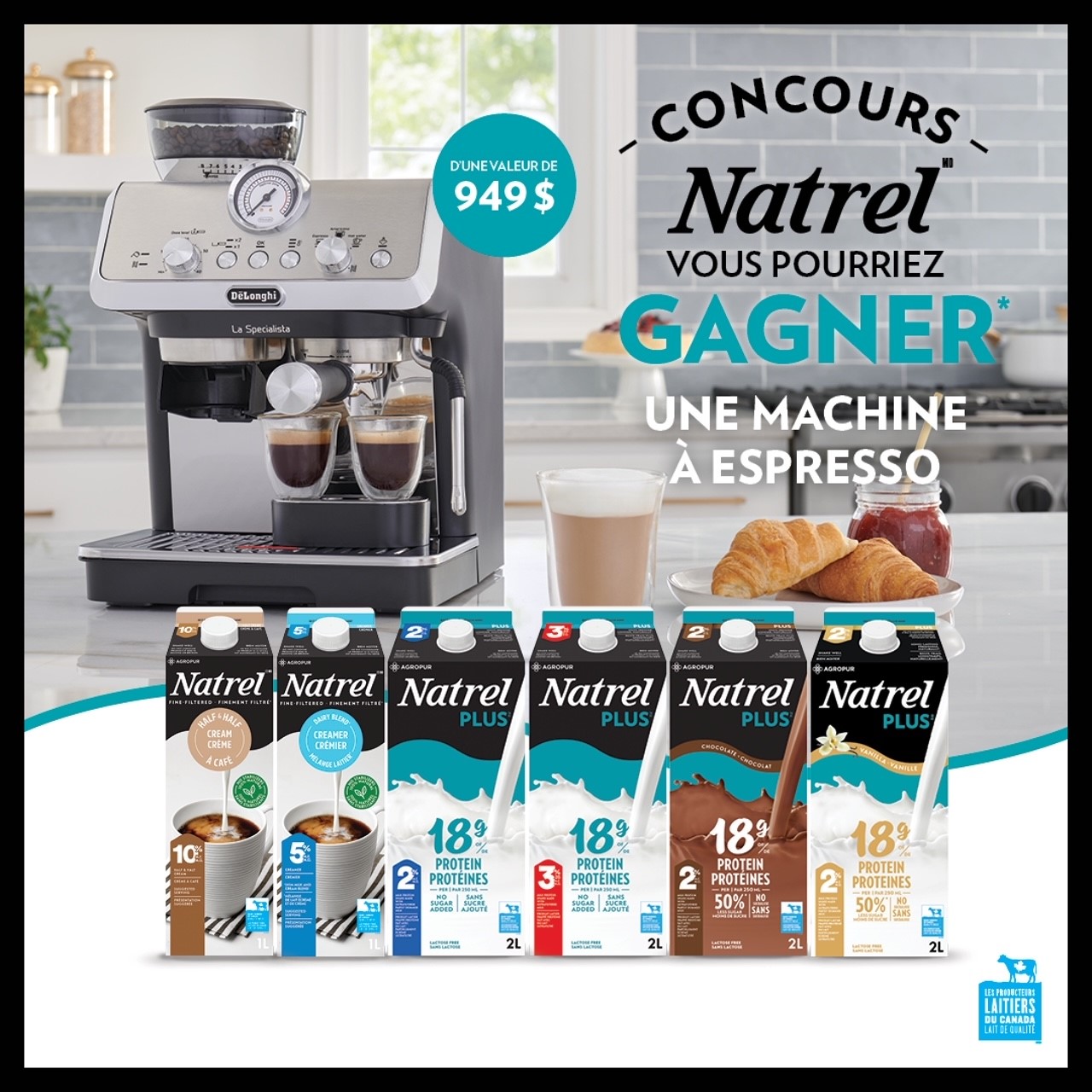 Avec Natrel, courez votre chance de remporter une magnifique machine à expresso, d'une valeur de 949 $ dans vos 3 Convivio IGA extra.