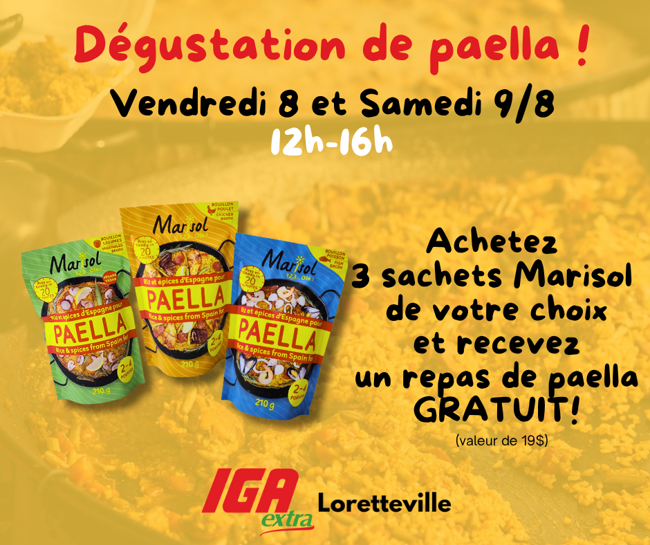 Offre exclusive : Achetez 3 sachets Marisol de votre choix lors de la dégustation (avec preuve de facture), et recevez un repas de paella GRATUIT à la sortie (valeur de 19$) !
