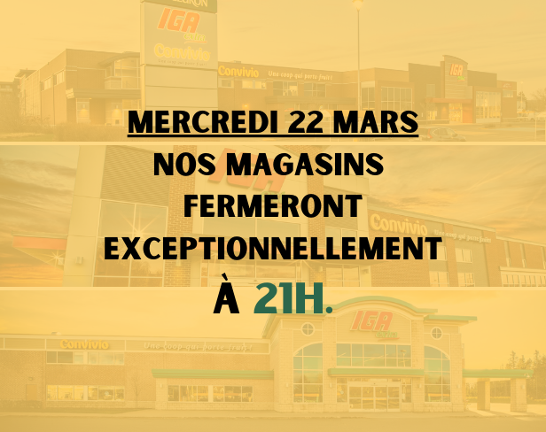 Nos 3 magasins Convivio IGA extra fermeront leurs portes exceptionnellement à 21h ce mecredi 22 mars.