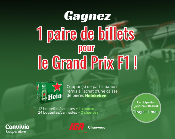 Du 10 au 30 avril, l'achat d'une caisse de bières Heineken dans votre IGA extra Chauveau pourrait vous faire gagner 1 paire de billets pour le Grand Prix F1 de Montréal !