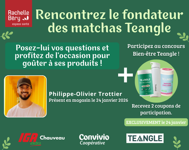 Le 24 janvier, de 13h à 17h, le fondateur de Teangle, Philippe-Olivier Trottier, sera de passage à l'espace santé Rachelle Béry de votre IGA extra Convivio de Chauveau !