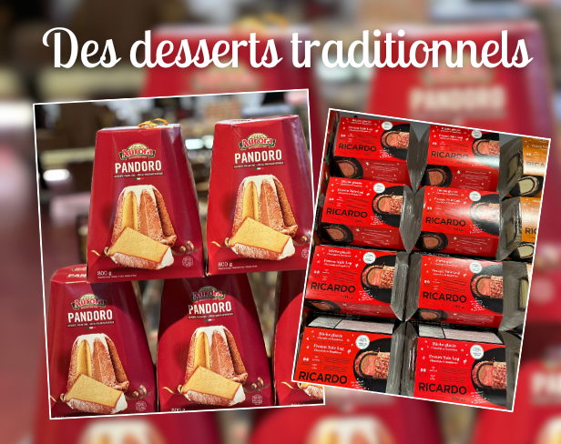 Découvrez nos douceurs des Fêtes : le pandoro, moelleux et délicatement sucré et la fameuse bûche de Noël traditionnelle crémeuse.