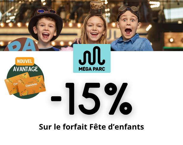 Cette belle collaboration vous offre 15 % de rabais sur le forfait Fête d'enfants du Méga Parc !