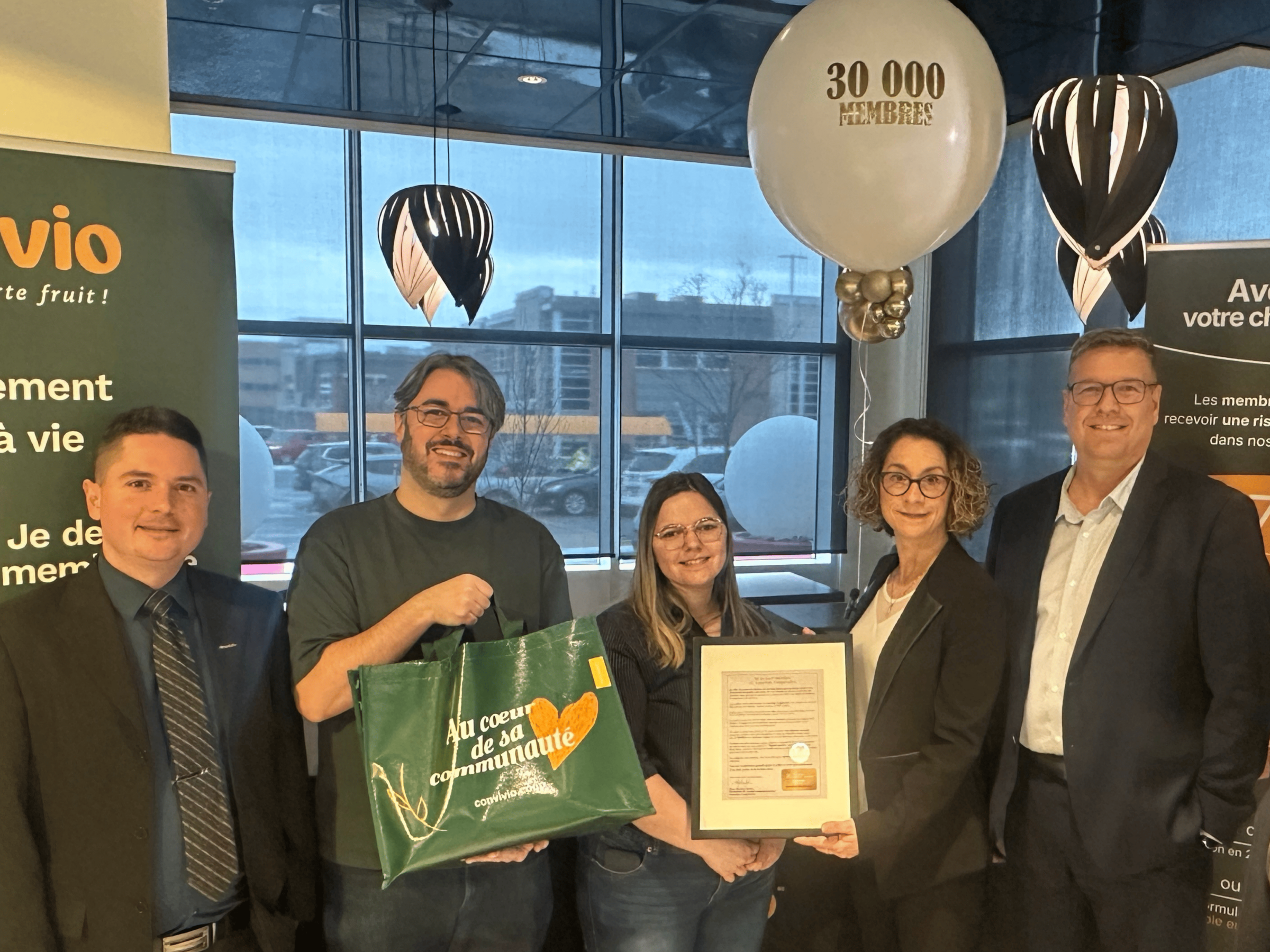 À l’occasion du passage au 30 000è membre, Convivio a tenu à souligner cette étape en accueillant officiellement M. Jonathan Montmigny et sa conjointe, Amély Cazes, entourés de membres de la direction et du conseil d’administration.