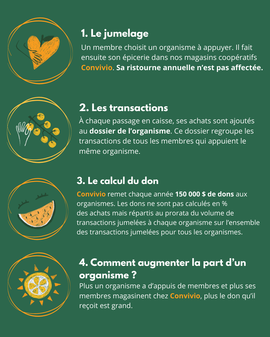 En tant que l’une des plus grandes coopératives en alimentation de détail du Québec, à travers son Programme de dons, Convivio, Coopérative s'engage à: