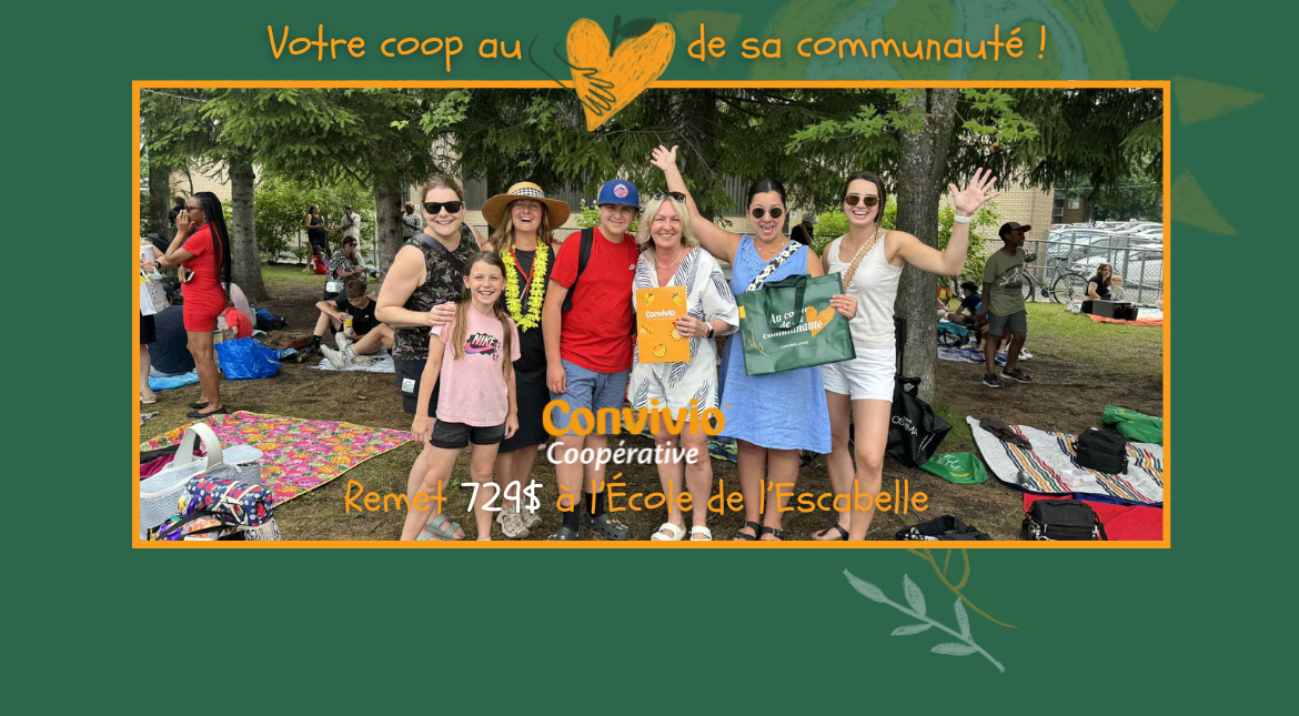 Un des 7 principes de base d’une coopérative est L’ENGAGEMENT ENVERS LA COMMUNAUTÉ. Convivio, grâce à la fidélité de ses membres et de sa clientèle, contribue au développement de sa communauté en soutenant divers projets et services améliorant la qualité de vie des citoyens.