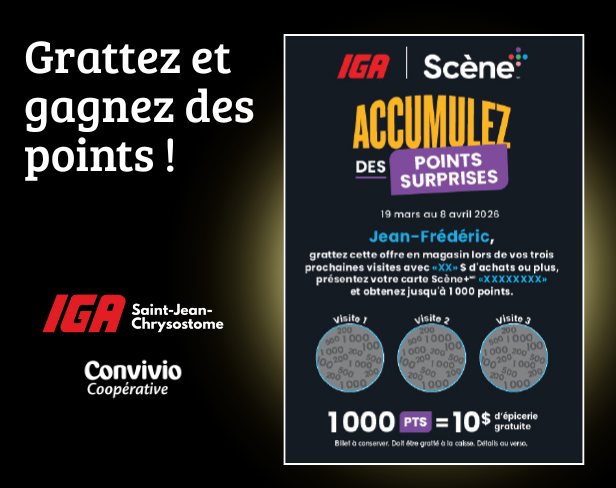 Lire l'articleVous habitez à Saint-Jean-Chrysostome et êtes client de notre beau IGA Convivio ? C'est votre jour de chance ! Surveillez bien votre boîte aux lettres, une surprise s'en vient ! ...