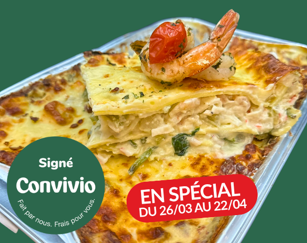 Lire l'articleEnvie d'un bon plat réconfortant et rassembleur ? Ça tombe bien ! Du 26 mars au 22 avril, profitez d'un spécial sur la lasagne aux fruits de mer Signé Convivio ! ...
