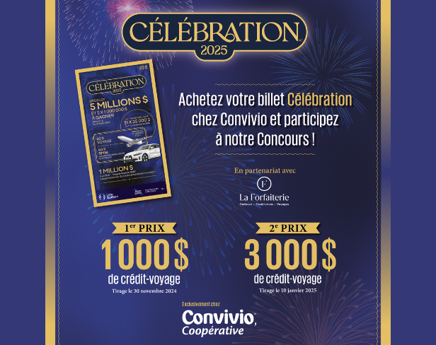 Lire l'articleAcheter vos billets Célébration chez Convivio pourrait vous rapporter gros ! N'oubliez pas d'acheter vos billets ! À chaque billet Célébration acheté dans votre coopérative Convivio, vous recevez un...