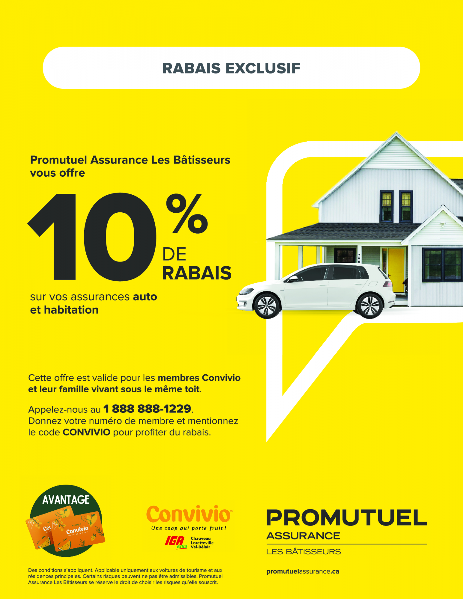 En tant que membre de la coopérative Convivio, vous pouvez profiter de votre avantage exclusif en partenariat avec Promutuel Assurance Les Bâtisseurs ains : bénéficiez d'un rabais de 10% sur vos assurances auto et habitation avec Promutuel Assurance Les Bâtisseurs. Une occasion exceptionnelle d'économiser tout en assurant la protection de votre domicile et de votre véhicule.