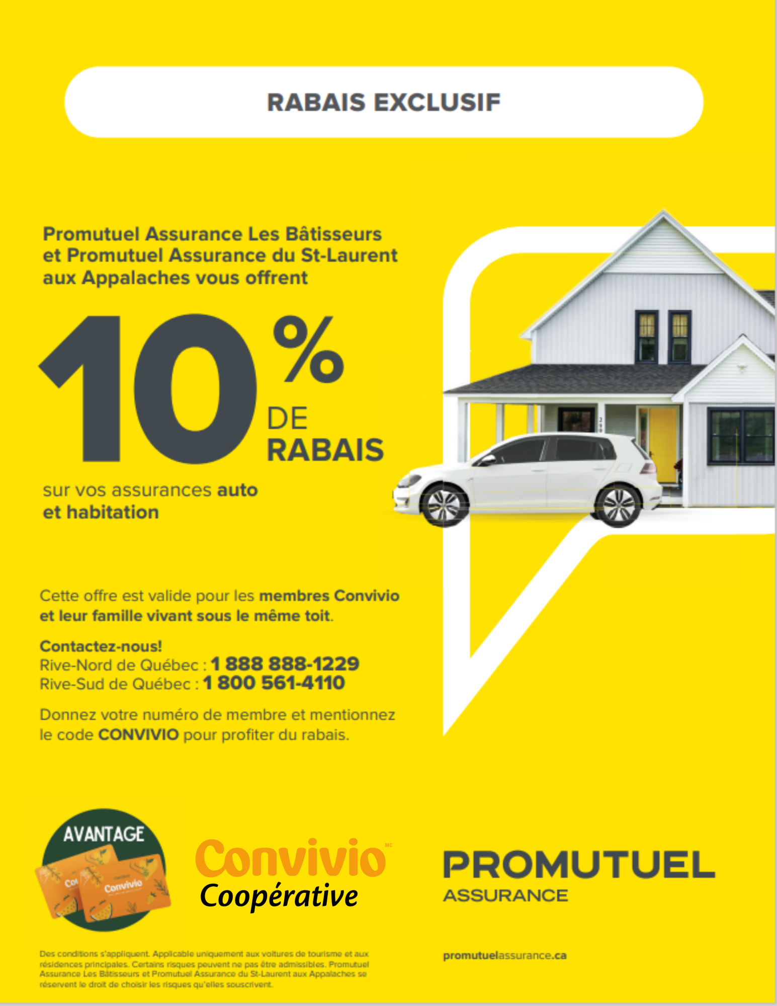 En tant que membre de votre coopérative Convivio, vous pouvez profiter d’un avantage exclusif auprès de notre partenaire Promutuel Assurance.
