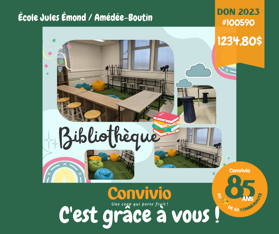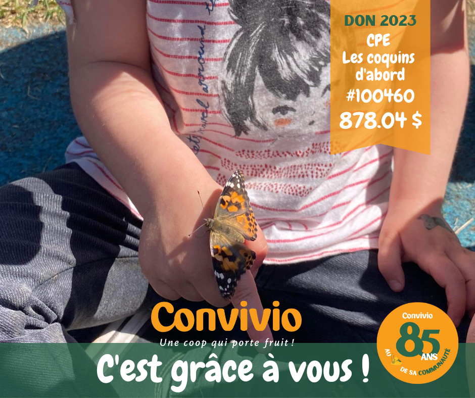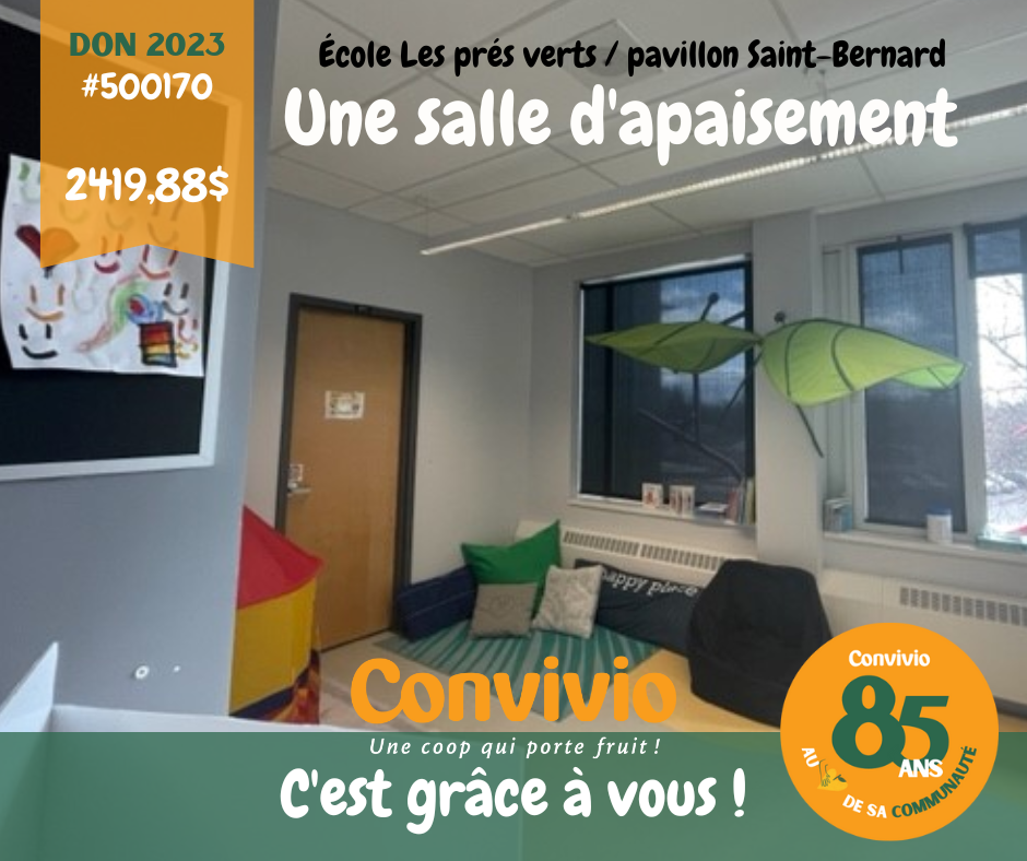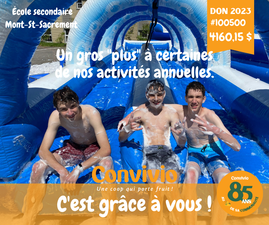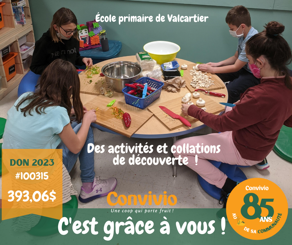 Notre programme de dons Convivio permet de reverser 150 000 $ tous les ans à une centaine d'organismes, notamment de nombreux C.P.E., écoles primaires et secondaires de notre secteur. Un don qui chaque année fait la différence auprès de nos plus jeunes. Que ce soit pour organiser plus d'activités récompenses, acheter de l'équipement complémentaire, des collations santé, ...