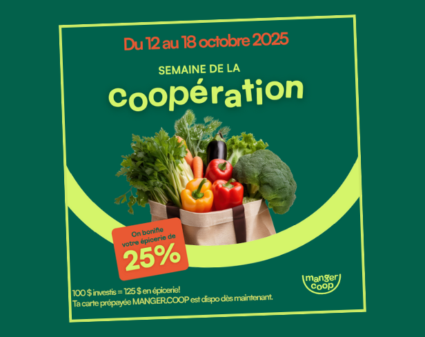 Cette semaine, à l’occasion de la Semaine des coopératives, nous vous remercions de votre fidélité avec une bonification de 25 % sur les cartes prépayées achetées en ligne ![]()