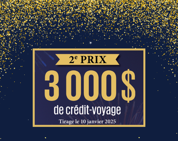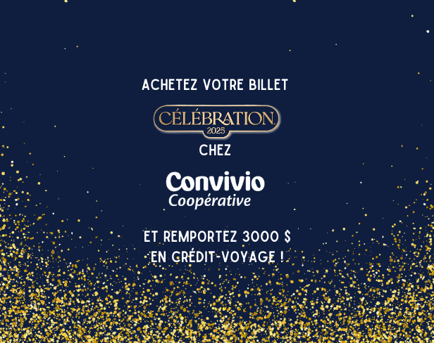 Cette année encore, on vous gâte chez Convivio. À l’achat de votre billet Célébration, participez à notre célèbre concours Célébration – exclusivement chez Convivio ! Cette année, nous aurons deux heureux gagnants et un total de 4000 $ de crédit-voyage à vous faire gagner auprès de notre partenaire La Forfaiterie !