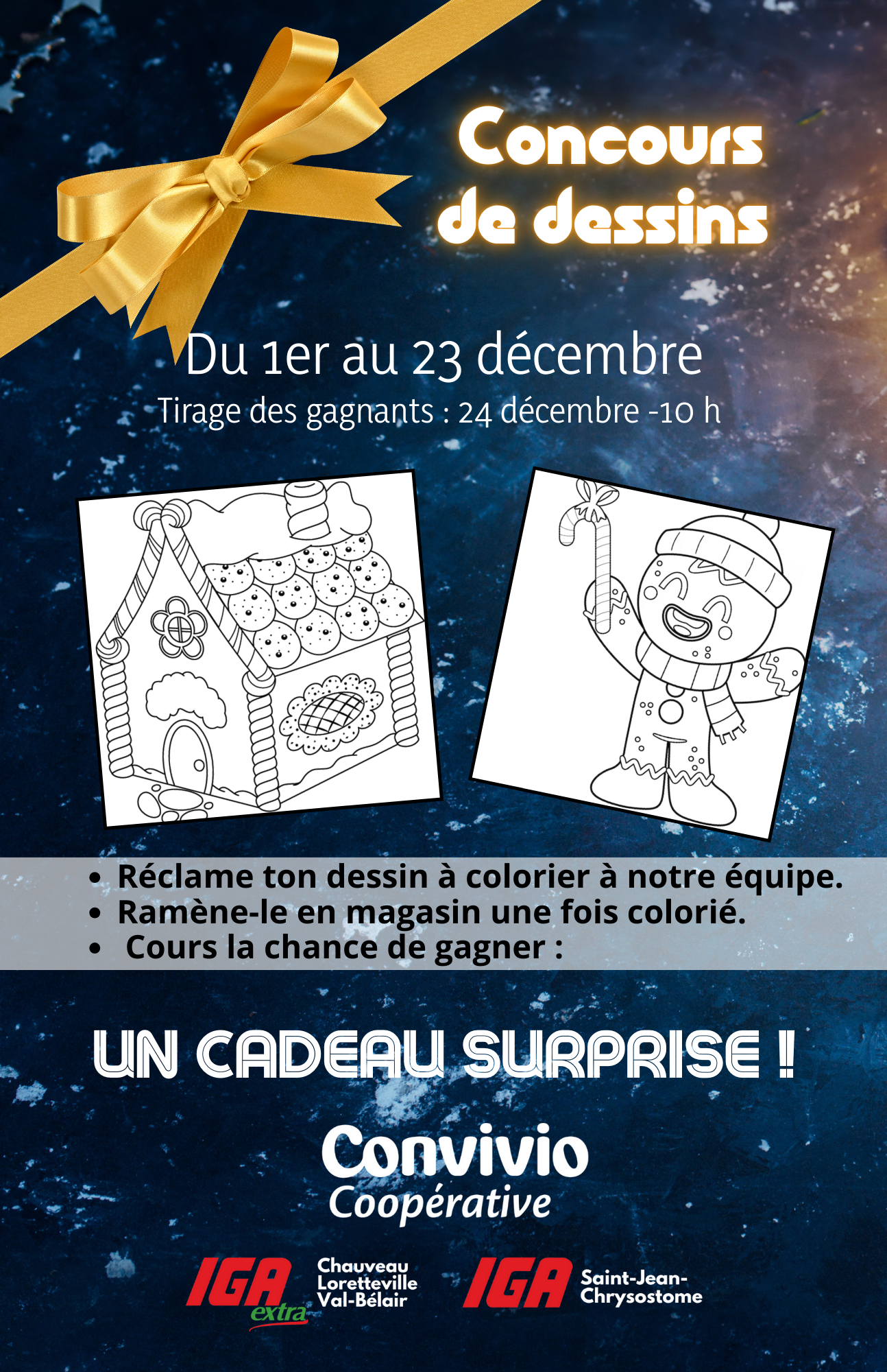 Mets de la couleur des fêtes dans ton magasin Convivio. Du 1er au 23 décembre, demande ton dessin aux caisses et remet-le à notre équipe pour qu’elle l’expose dans ton magasin. Tu cours la chance de remporter une belle surprise (Tirage des gagnants : 24/12 - 10h).