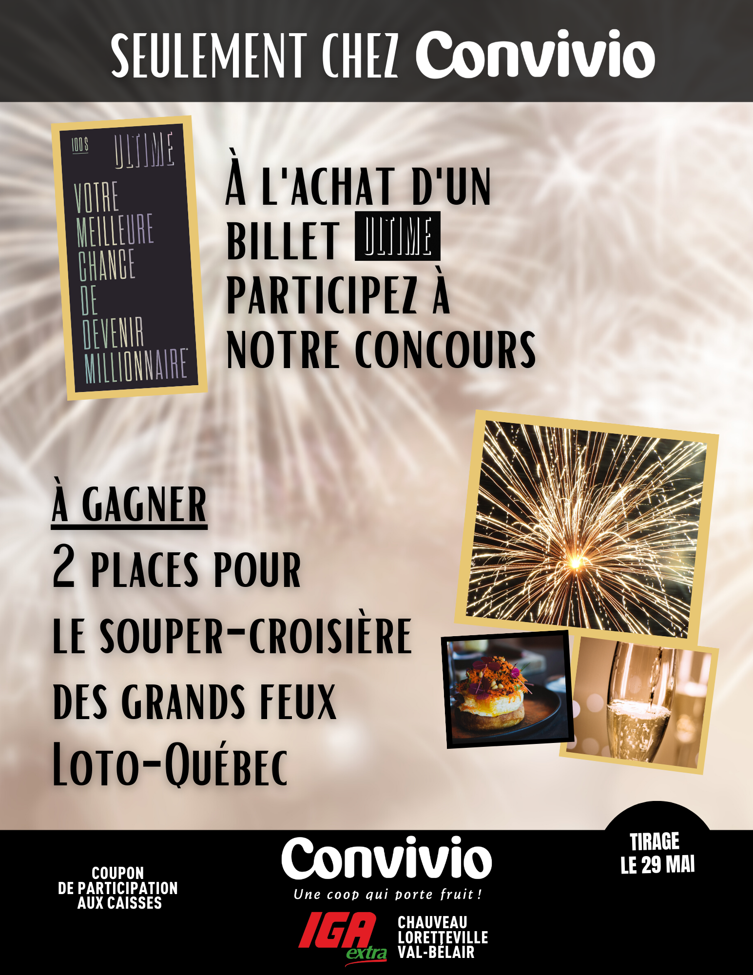 N'hésitez plus et venez acheter votre billet Ultime dans l'un de vos 3 Convivio IGA extra (Chauveau, Loretteville et Val-Bélair).