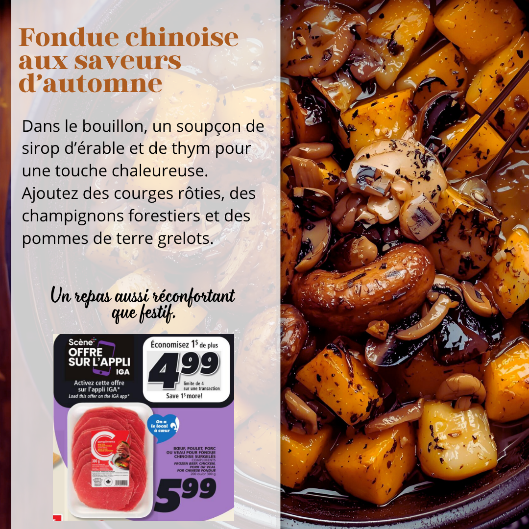 Découvrez les idées de menu de la semaine qui s’inspirent des meilleurs produits présentés en circulaire chez IGA, à cuisiner avec les saveurs locales qui font la richesse de l’automne : légumes racines, courges, sirop d’érable, viandes de qualité et produits frais du marché.