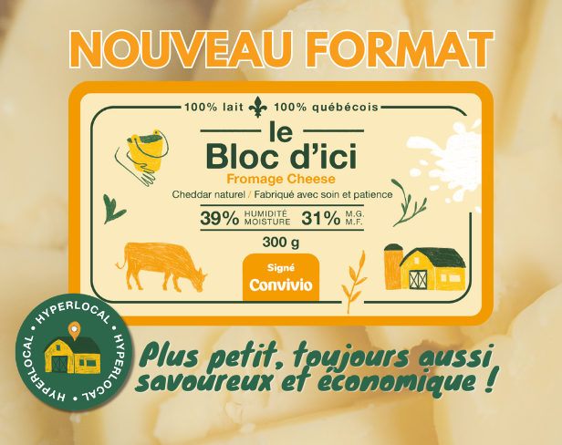 Si vous aimez le fromage, vous connaissez sûrement nos fromages Signé Convivio 100% lait, 100% québécois. Hyperlocaux et économiques, notre gamme de fromages accueille une nouvelle version du "Bloc d'ici".