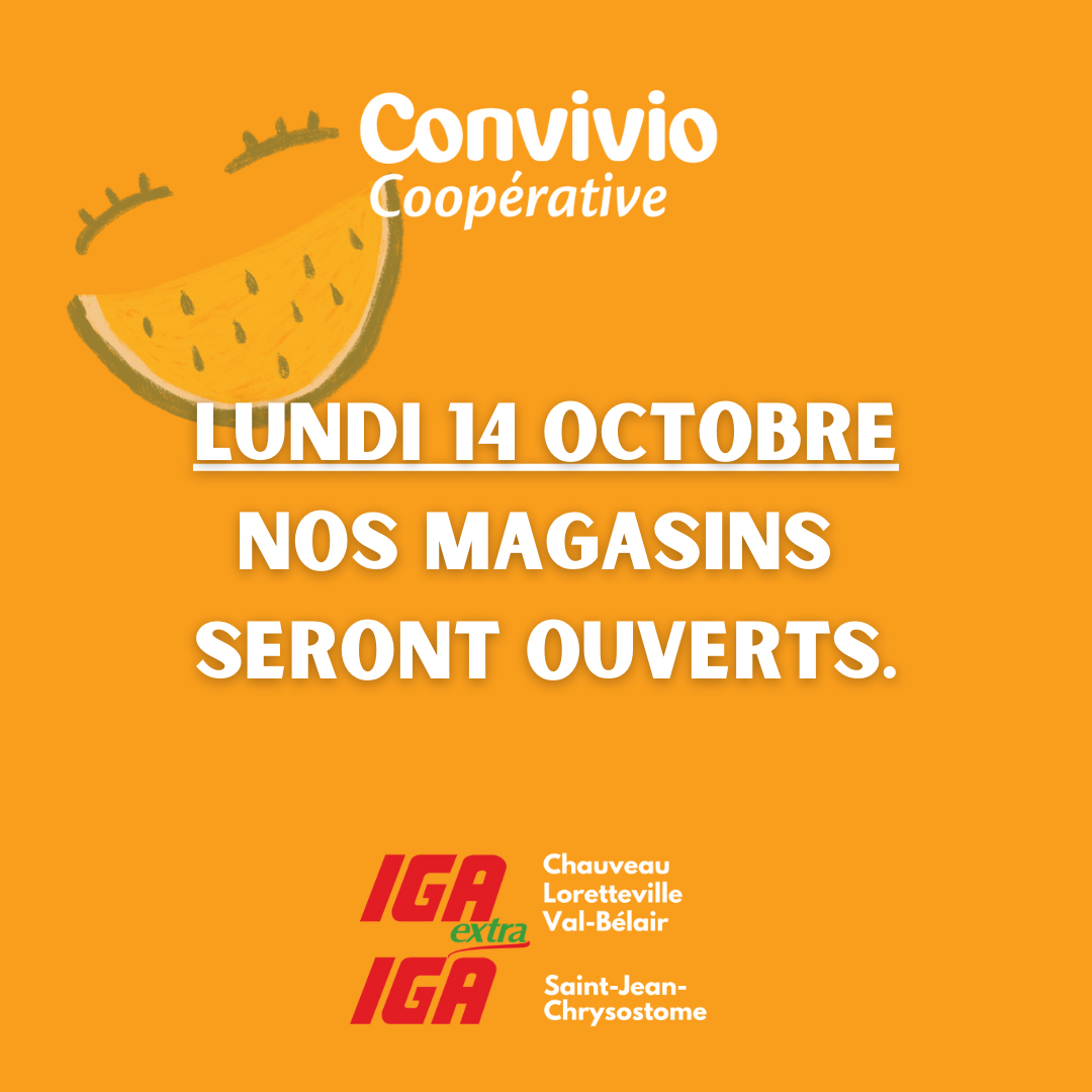 Voici les horaires des Fêtes vos 4 IGA et IGA extra Convivio : Ces horaires sont valables pour : Le IGA extra de Chauveau : 2295 av. Chauveau Le IGA extra de Val-Bélair :...