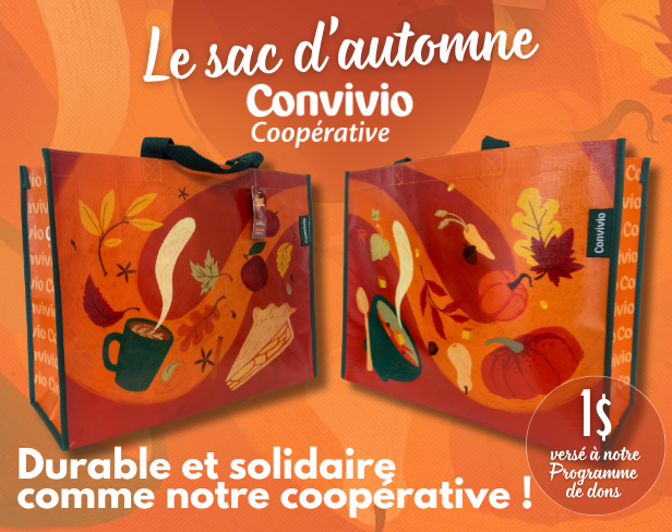 Avec ses magnifiques couleurs qui célèbrent la saison, notre sac d’épicerie d’automne est en vente exclusivement dans vos 4 magasins coopératifs Convivio.