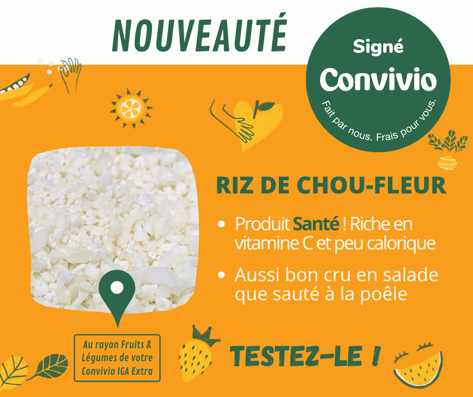 Un produit Santé, peu calorique et plein de vitamine C, aussi bon cru en salade que sauté à la poêle, notre nouveau produit "Signé Convivio", c'est le riz de chou-fleur !