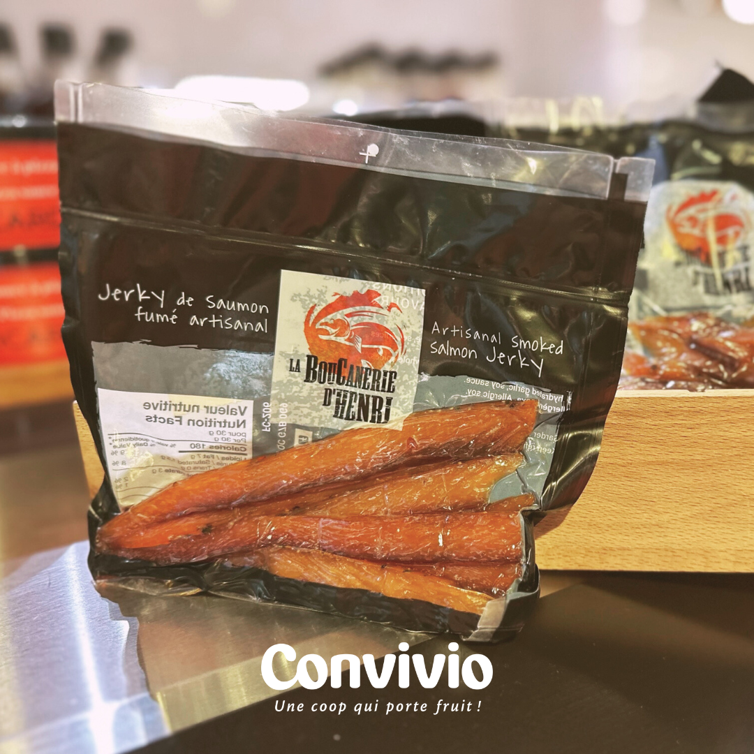 Retrouvez le Jerky de saumon de la Boucanerie d'Henri dans votre Convivio IGA extra de Chauveau.