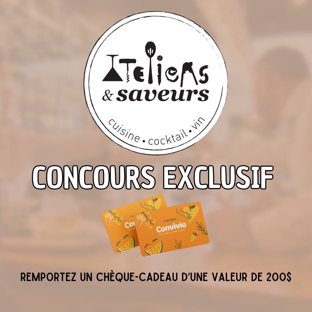 Pour célébrer votre nouvel avantage membre auprès de notre partenaire "Ateliers et Saveurs ", nous sommes heureux de vous faire participer à un superbe concours.