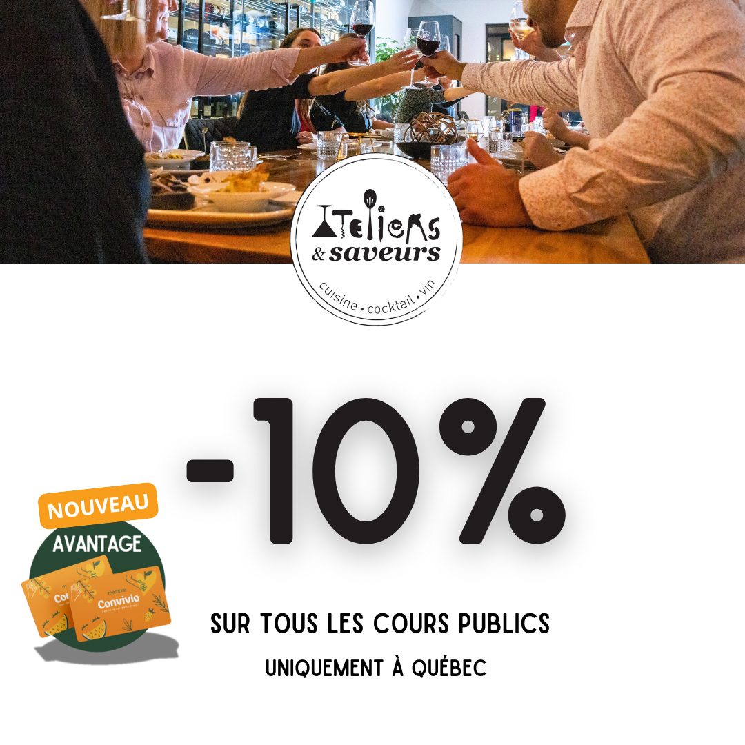 Bonne nouvelle pour curieux/curieuses, épicuriens/épicuriennes ou amateur/amatrice de bonne bouffe ! Votre coopérative a conclu un nouveau partenariat pour ses membres avec un partenaire reconnu dans la région de Québec : Ateliers & Saveurs.