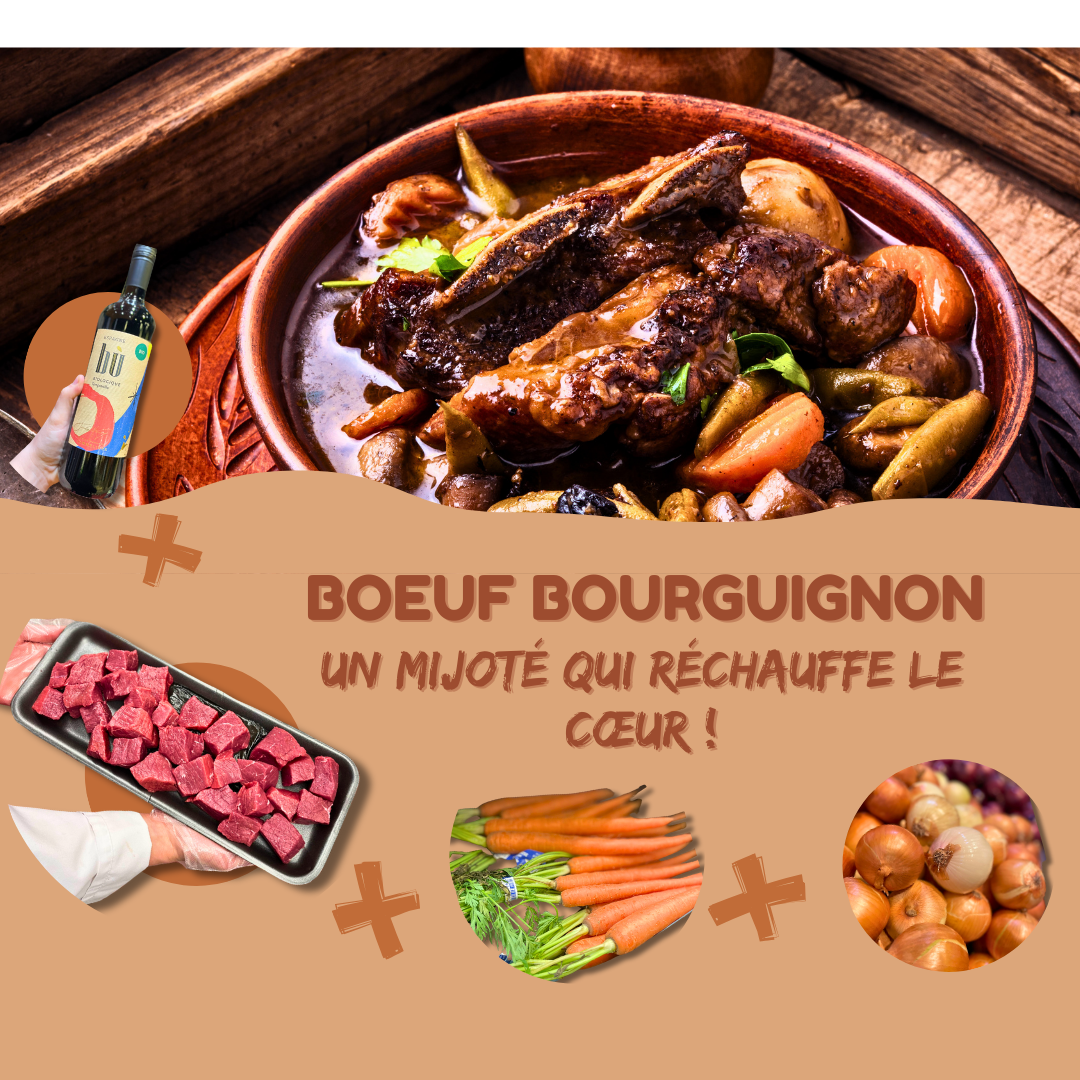 Bœuf bourguignon lentement mijoté avec du vin rouge, des carottes fondantes et des oignons doucement caramélisés. Un plat généreux qui fait du bien et qui rassemble autour de la table.