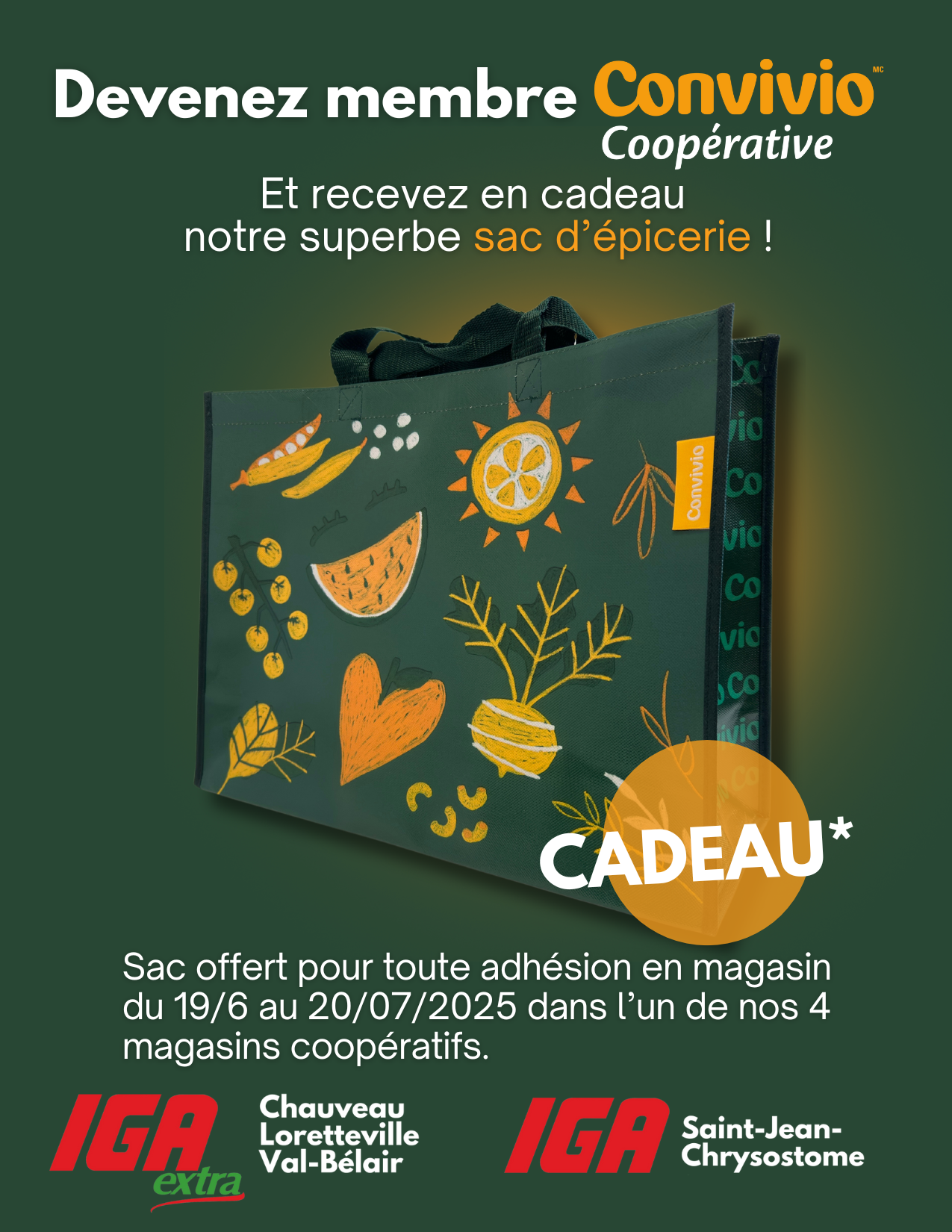 Du 19 juin au 20 juillet dans nos 4 magasins coopératifs, remplissez le formulaire d'adhésion en magasin, acquittez-vous de la part sociale de 30$ (une fois, à vie, remboursable) et recevez votre sac en cadeau.