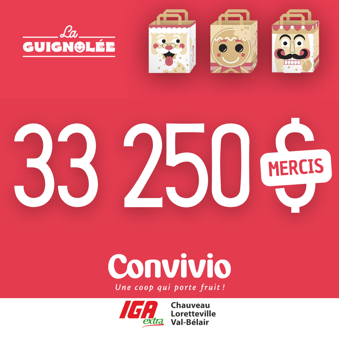 Avec près de 33 250 $ récoltés, c’est un nouveau record de dons pour la Guignolée que nous avons enregistré dans les 3 IGA extra de notre coopérative ( Chauveau, Loretteville et Val-Bélair). Cette année, vous pouviez contribuer de deux façons : en achetant la Bûche solidaire et en faisant un don en caisse. Vous avez également été nombreux à donner des denrées alimentaires dans les paniers mis à disposition aux caisses de nos magasins.