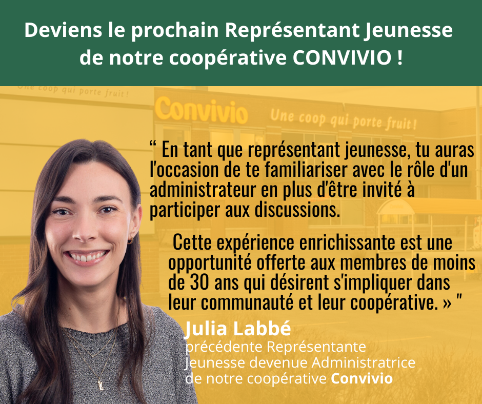 Conformément au Règlement numéro 1 de CONVIVIO, COOPÉRATIVE, le conseil d’administration vous invite à poser votre candidature pour le poste de représentant jeunesse au sein de son CA si vous pensez satisfaire aux exigences ci-après.