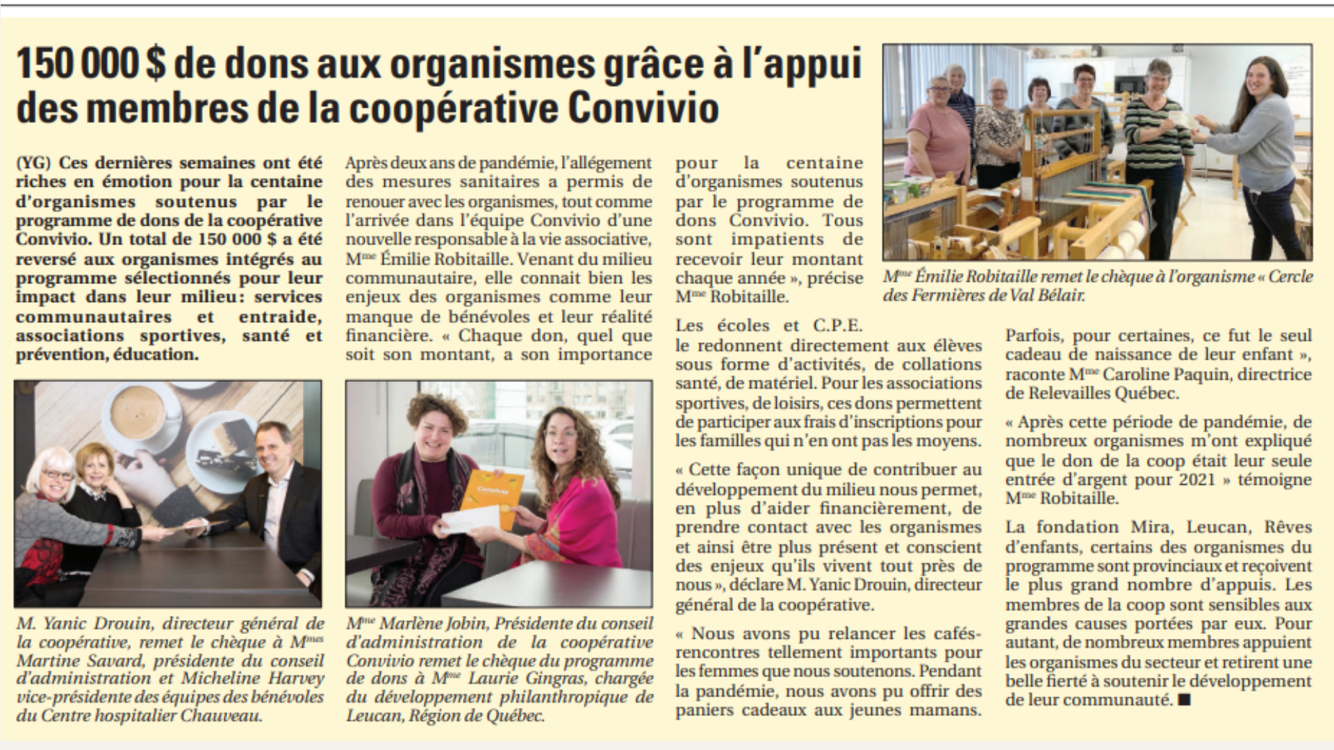 Convivio, Coopérative reverse 1 676 304 $ en ristourne à ses membres et 175 000$ à la sécurité alimentaire de sa communauté Québec, le 2 décembre...