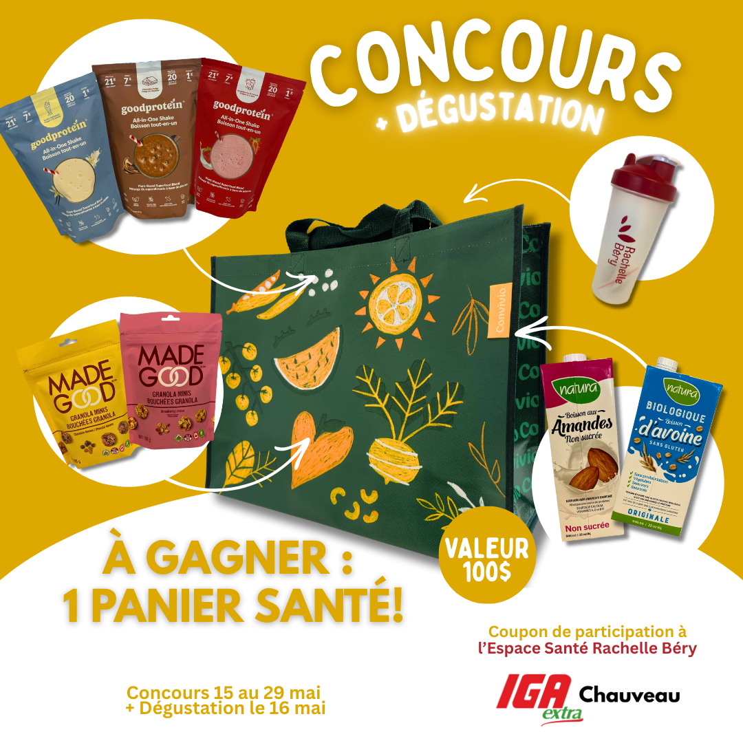 En collaboration avec Good Protein, Convivio vous gâte ! Courez la chance de gagner un panier santé d’une valeur de 100$ dans votre espace Santé Rachelle Béry de IGA extra Convivio Chauveau.