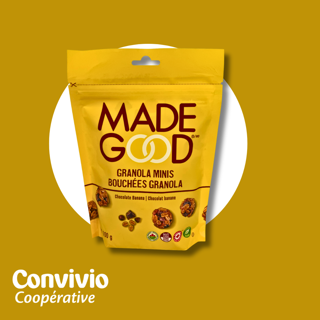 1 sac de bouchées granola Made Good – Chocolat bananes (100 g) : une bouchée gourmande et saine, avec légumes cachés, vitamines, sans allergènes, végane, bio et sans OGM.
