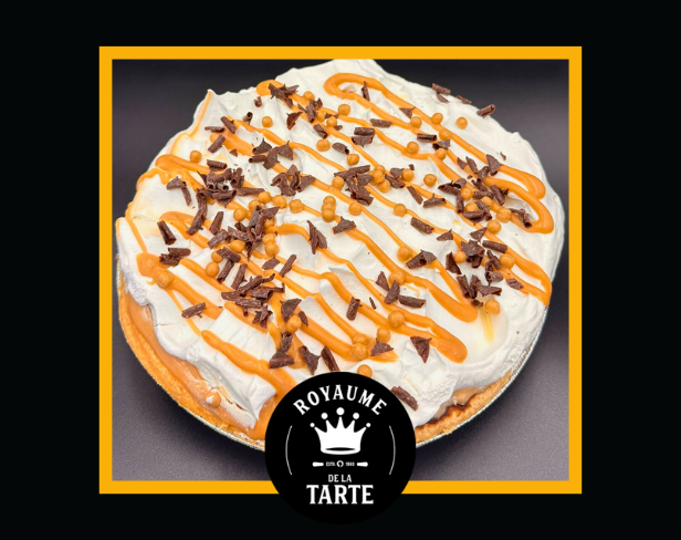 Une tarte au fond croustillant et feuilleté, qui fait la renommée du Royaume de la tarte, sur laquelle trône une préparation onctueuse au chocolat mi-amer et une couche décadente de caramel salé. Le tout couronné d'un nuage de crème fouettée et d'un soupçon de caramel en rappel.