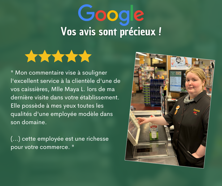 Bravo et Merci à Mademoiselle Maya pour son service exemplaire que l’une de nos clientes a souligné dans son avis déposé sur google. Nous sommes d’accord avec elle, Maya est une richesse pour notre coopérative et nous sommes heureux de la compter parmi nous.