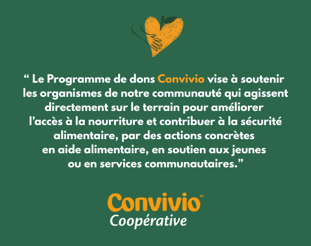 Tous les ans, depuis près de 15 ans, Convivio, Coopérative reverse 150 000$ aux organismes accrédités à son Programme de dons.